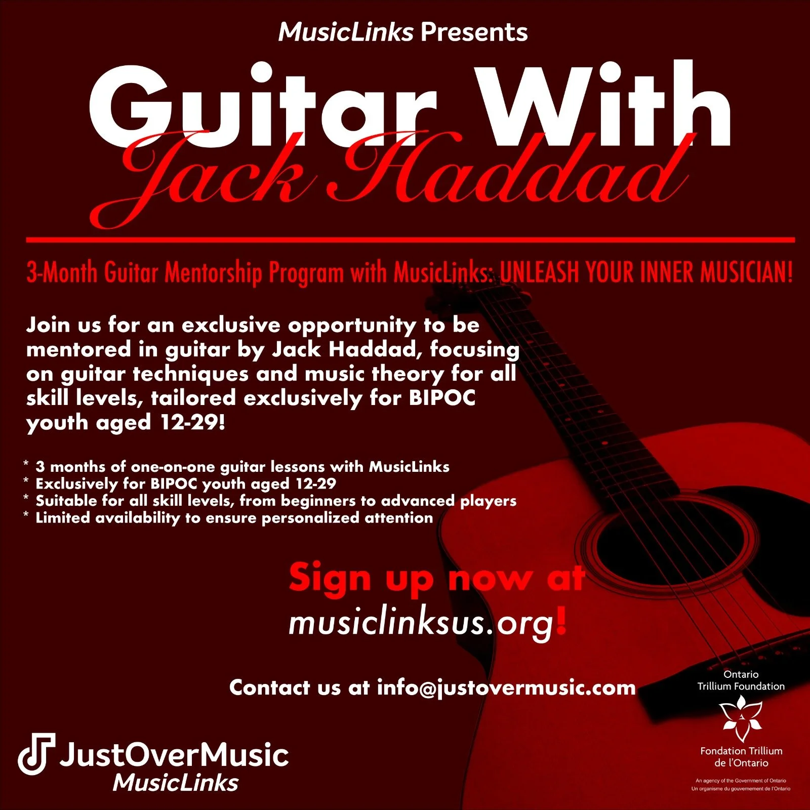 Are you ready to unleash your inner guitarist and elevate your playing abilities to new heights? Join Jack Haddad's exclusive Guitar Mentorship Program, tailored specifically for BIPOC youth aged 12-29! Under Jack's expert guidance, you'll dive into the world of guitar mastery, learn advanced techniques, and unlock the secrets to spellbinding performances.